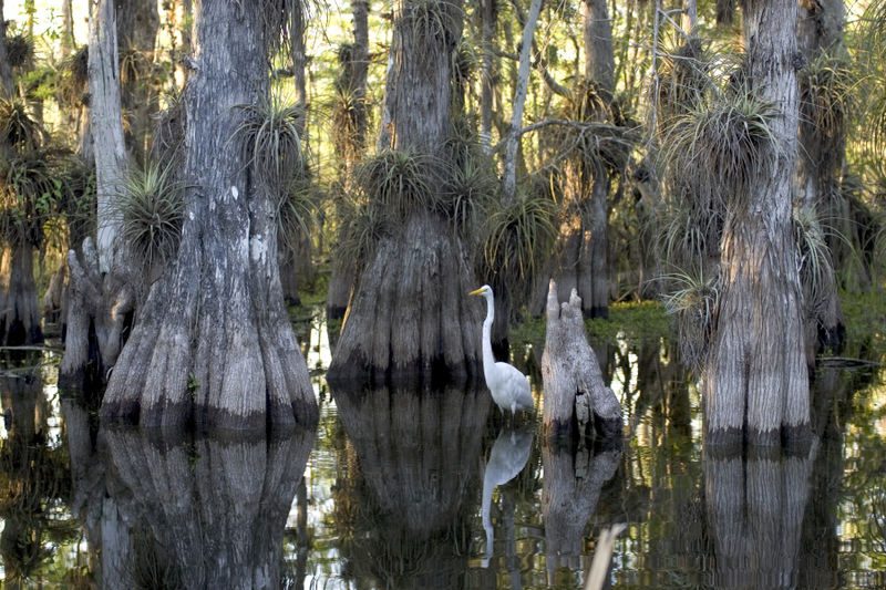 A great egret fishes below ancient bromeliads that flourish on the bald cypress trees
