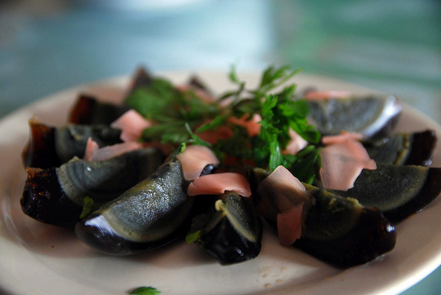 Don’t let the name fool you, the egg is not really a hundred years old. It is actually a bird’s egg (quail or duck) that has been preserved using ash, salt, quicklime or clay so that it turns black. This delicacy is available in China and Taiwan. Once you get over the color, it is a pretty tasty treat.
