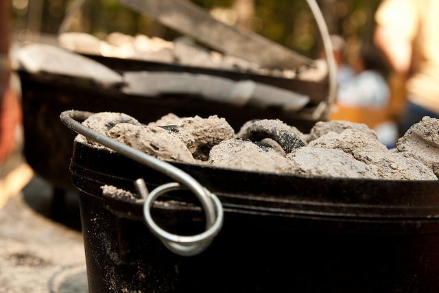 The general cooking temperature for a Dutch oven is about 350 to 400 degrees Fahrenheit. This heat comes from coals that are placed below the Dutch oven as well as on top of its lid. With a chimney starter, the coals get started quickly and will heat up evenly. The charcoal needs to be ready about twenty to thirty minutes before starting to cook the meal.