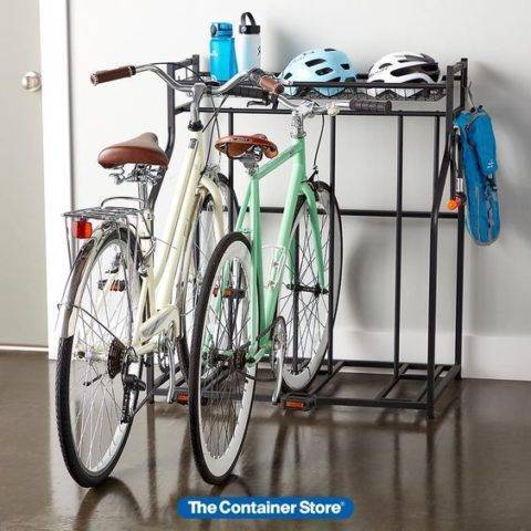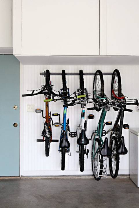 This can be achieved by either using a few different metal rods or with the wood of your choice. But the goal is to create a few sizeable openings that will slot the front tire of your bike. You can even add a shelving unit at the top for water bottles, helmets and anything else you might need. Get as simple or fancy as you want to create an effective bike storage option.
