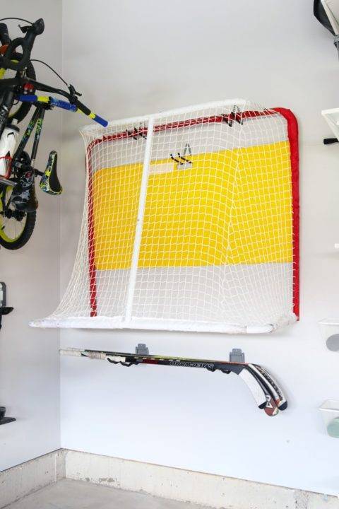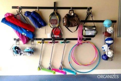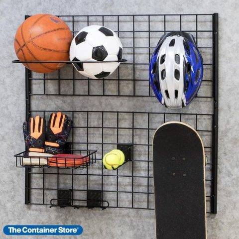 In a similar concept to pegboard, wire shelving can be quite versatile. Yes, the holes are quite a bit bigger, but there are a ton of possibilities for storage. You can find hooks and shelving options that attach to the wire rack, creating a versatile option for sports accessories of all kinds. Balls, gloves, helmets, and even skateboards can all be stored in the same neat space.