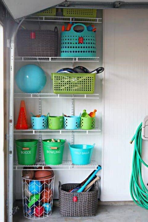 The garage can make for a great activity space for kids. But it can be all too easy for toys to litter and clutter the entire space. With a few simple baskets and screws, you can create a countertop or wall-mounted storage solution. Each basket can be labeled for its desired purpose, making it easier than ever to find the toys that you want and to put them away when it comes time. Kids will be messy but their toys can be stored as neatly as possible.