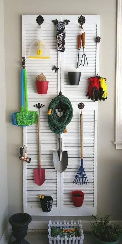 Much in the same way as you would use pegboard, you can use shutters as storage options, too. If you want to create a chic, stylish option for storing your gardening options, you can repurpose old shutters for just such an occasion. Mount with assorted hooks and you can create an old-school rustic feel that serves a much more functional purpose. Mounted on a garage wall, you can create the perfect garden storage.