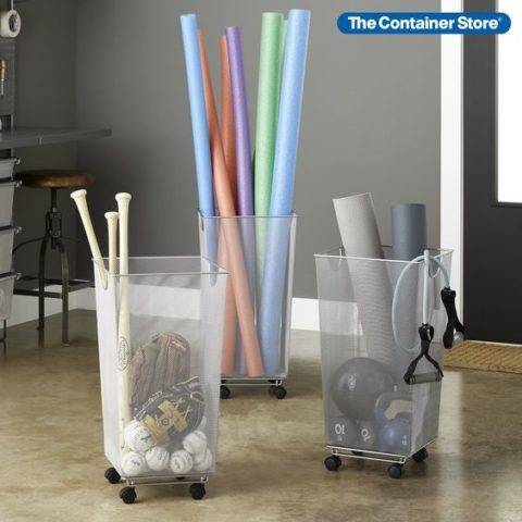 For those taller, awkward items – pool noodles, baseball bats, hockey sticks, yoga mats – you need to use a little bit of creativity. With a simple square of wood or steel grating, you can mount some wheels and a tall steel mesh basket. All of the sudden, you have portable storage solutions for even the biggest and most awkward of items in your garage.
