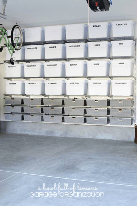 Not everything on the list has to be built from scratch. With some simple storage shelves, you can create the optimal storage situation. Add a few bins with custom labels and you can get as organized as you want to be. It doesn’t all have to be a big project when it comes to your garage or outdoor storage options.