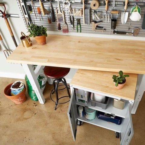 If you have a workbench built, you may or may not have drawers built-in. If you don’t, you can create a truly versatile and unique storage option that goes with it: a rolling storage cart. Just find a small metal cabinet, mount a wood topper to it that matches the surface of your workbench, and mount some wheels. You can bring the important items with you all throughout the garage.