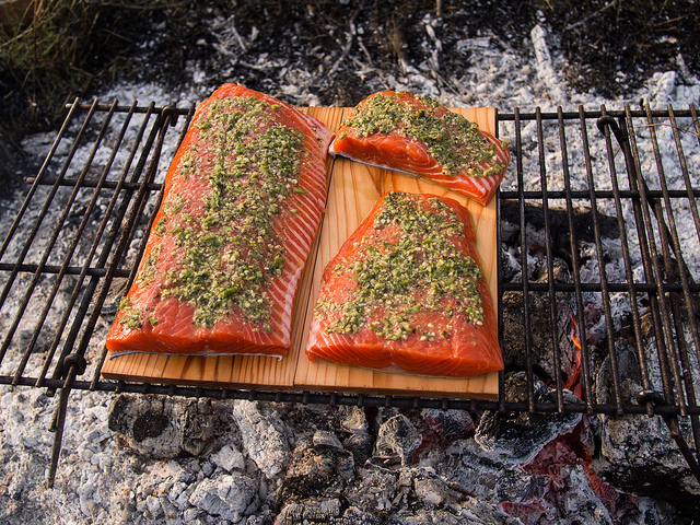 Find a piece of wood with a flat face, clean it, and put your piece of fish or meat on it, you can fix the food with small wooden wedges and then position the food on the plank so that it is facing the heat, just reposition as needed so that the food cooks evenly.