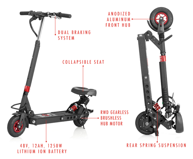 The Pro is equipped with a 48V 1,500 Watt direct drive gearless hub motor. Over 2 horsepower allows flying speeds of up to 25 miles per hour! The rear wheel drive motor paired with 8″ wheels and all custom sport tuned electronics ensure this scooter handles better and climbs hills like you’ve never experienced before.