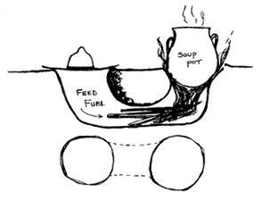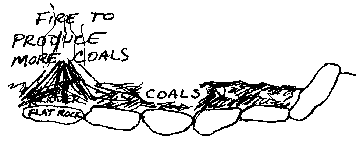 This can be enhanced by building the fire in the shape of a chimney. For cooking, this concentrates the heat in the center and is good for boiling water in a pot, and is a good way to get the fire going, and coals produced. The best cooking fire for roasting and grilling has an even bed of coals, with heat reflected back in from the rocks on the sides of the pit.
