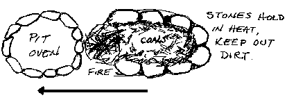 If I am going to do a pit roast, another, deeper pit is dug a foot or so past one end of the main fire, and the hump of dirt between the two is not rock covered. Pit ovens should be dug deep and wide enough to accommodate a stone lining and a green vegetation lining as well as the food.