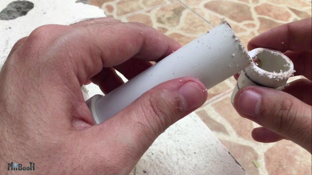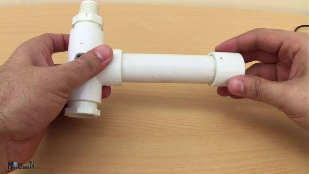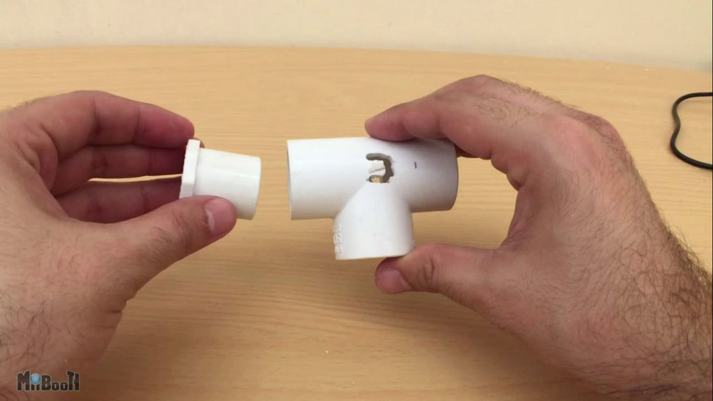 2- The PVC pipe goes at the bottom of the T joint as the handle. I cut my previous bow for the unused pipe.