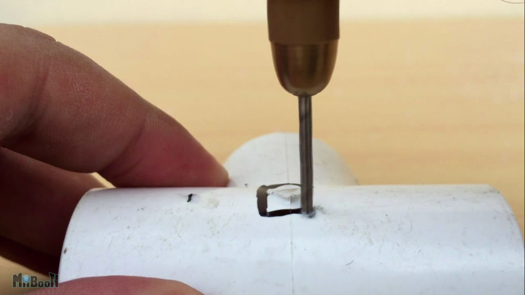3- Use the drill bit to eat through the thin walls between the holes. (Alternately, you can use a hot nail to cut through the PVC just like I did in my first video)