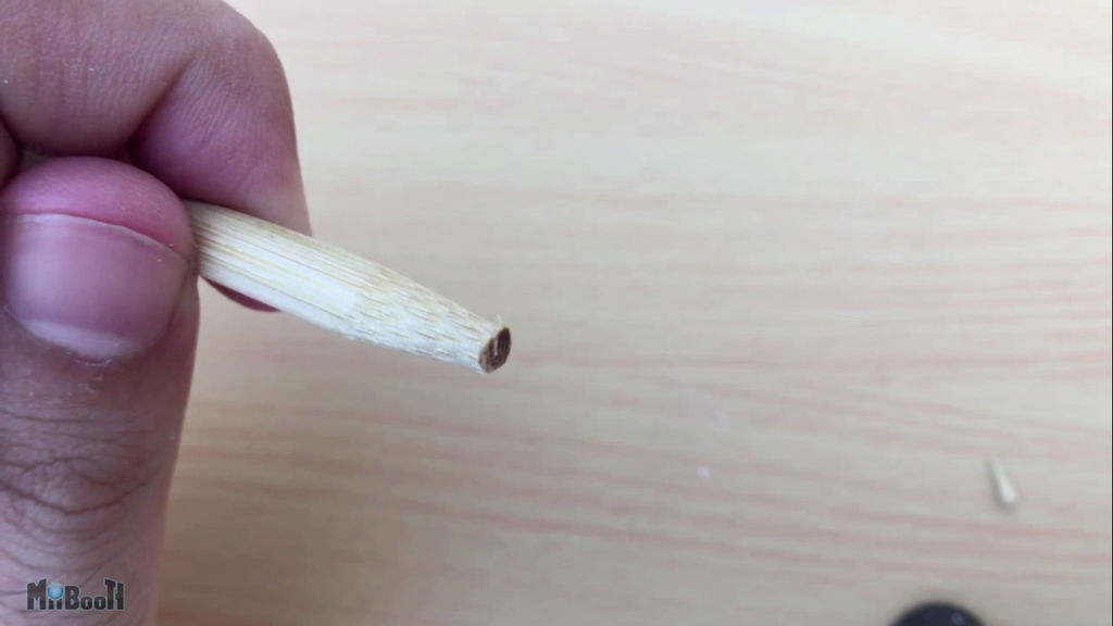 5- Place it in between the split end of the tip such that half the nail is sticking out and then press the two ends together with a set of pliers. The hot nail will burn a little through the wood and should embed nicely.
