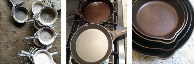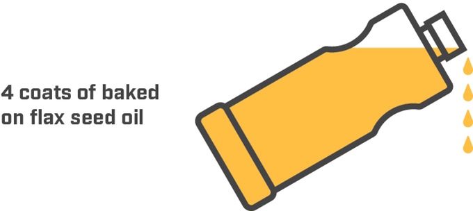 The skillets are then finished with 4 coats of baked on flax seed oil. The skillets spend about 3 hours in the oven per coat to fully cure the oil. The flax seed oil creates a hard and durable base to build further seasoning upon as your pan ages.