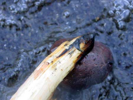 3. Wooden tongs are quite useful in handling the heated stones. Notice the steam escaping from the bottom of the rock as it hits the lake.