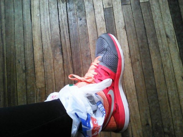 Plastic bags on top of your shoes will keep your feet dry when you’re outside in the rain. Use duct tape to secure the bags around your ankles. If the terrain is slippery, then put the plastic bags on top of your socks and then put the shoes on. This way the shoes will get wet, but your feet will stay dry.
