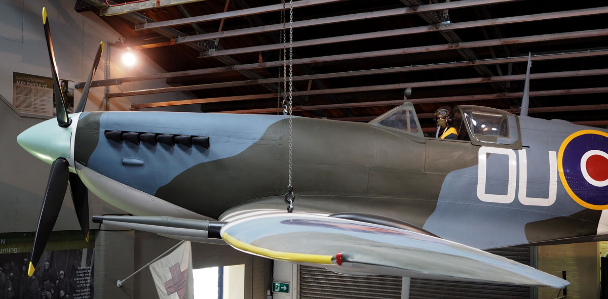 A full size replica ‘Spitfire’ hangs overhead inside, and a marvelous example of a Sherman tank stands at the entrance with weapons at the ready.