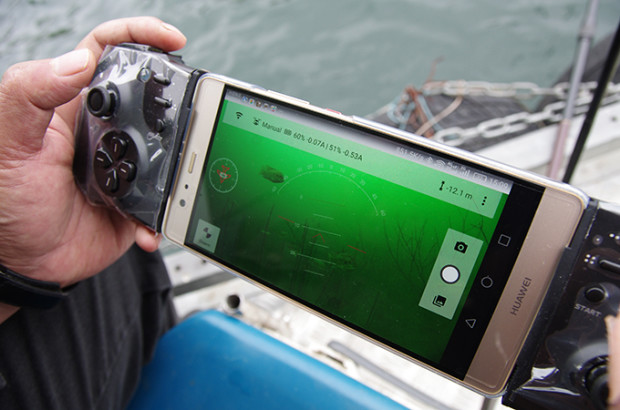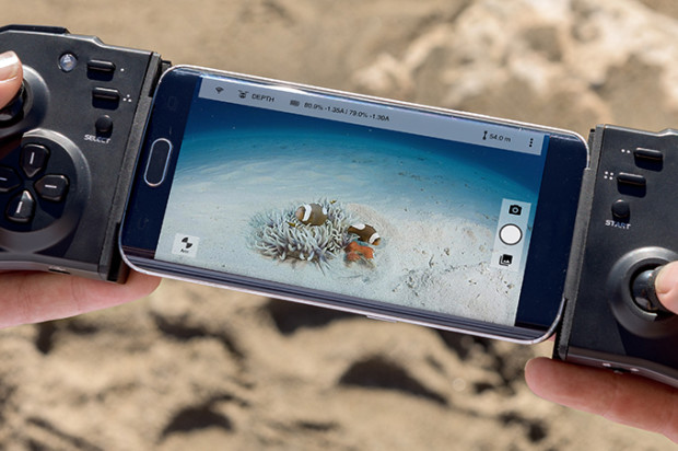 Your smartphone rests in the center of the remote controller, so you can view the live stream of your underwater exploration.