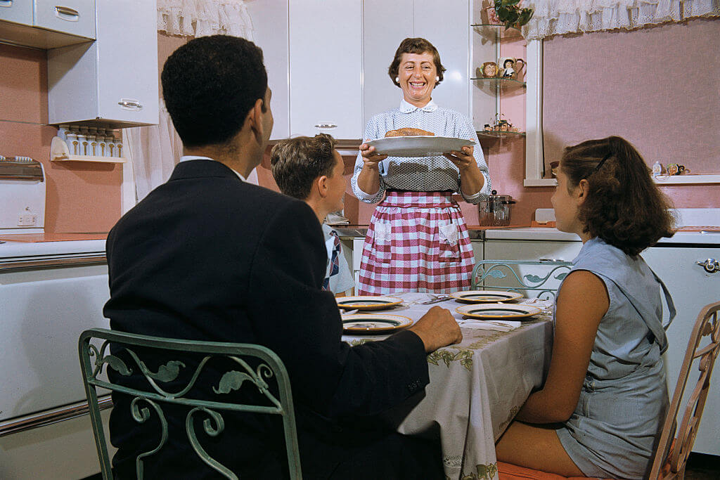 Many families sat down to dinner to a cooked meal of meat, vegetables, homemade desserts, and food when in season. Nothing was too complex while making most of the food groups at the same time. Meals weren't entirely unhealthy but straight to the point.