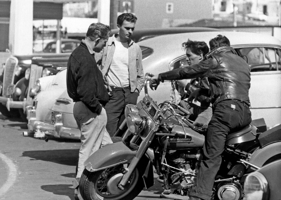 Some teenagers, like this group of young men, passed the time by hanging out on their motorcycles in parking lots. This group of San Francisco teens was known as greasers. They were young people with rebellious attitudes who liked rock and roll music, rockabilly, and doo-wop.