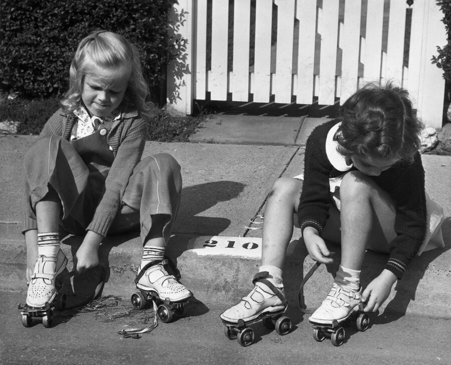 Roller skating was a popular pastime for kids in the 1950s. The photo here shows two young girls sitting on a curb putting on a pair of skates. Notice how they kept their shoes on and simply attached the metal skates to the bottom of them. A key was required to tighten the skates to the feet. It wasn't until 1979 that skates transformed into rollerblades.