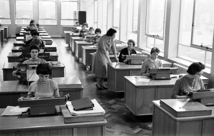 Pictured here is the typing pool at the offices of the London retailer Marks and Spencer in 1959. If a woman worked outside the home, one of the most popular jobs she would have held was a secretarial or typist position. Prior to the digital age, men often employed women who knew shorthand or could type.