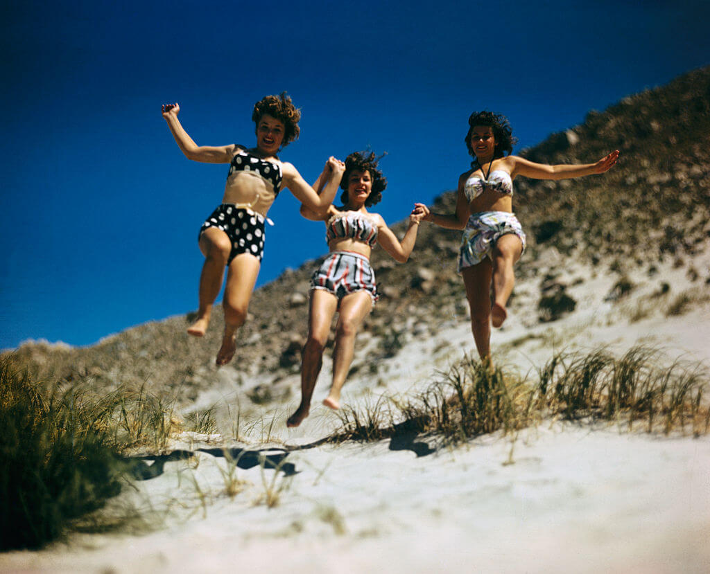 The young women pictured here are wearing swimsuits in Palm Springs, California. Fifties swimsuits were often made of nylon, taffeta, and cotton. They hugged a woman's curves and were more about making a woman look attractive than making her swim well. Bright patterns and tropical themes, such as flamingos, were common.