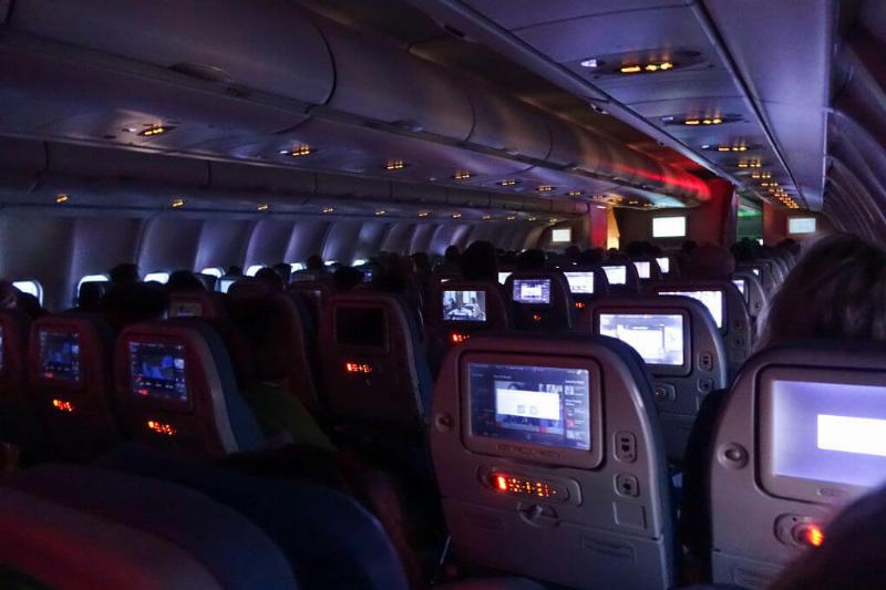 As the plane prepares for takeoff or for its descent, the lights in the cabin will get shut off. This is never really explained and there's not much to think of it since the lights get turned back on just a few minutes later.