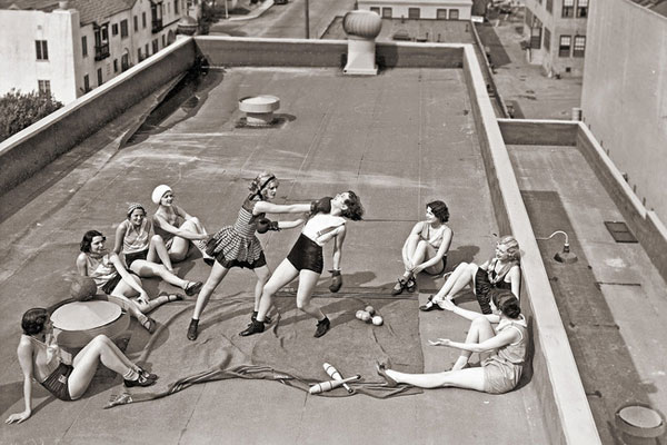 Here are some women boxing on a roof in 1938. No one had air conditioning, so practicing outside was more popular than in a stuffy theater. However, it’s unlikely they were actually throwing punches…at least not heavy ones. While the blonde boxer is probably actually hitting the brunette, it’s likely just a stunt punch, hence the smiles all around.