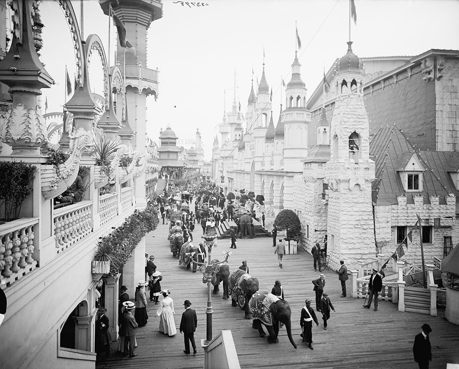 This festive scene was shot in Coney Island, New York, in 1905. Just a couple years before this photo was taken, Luna Park, the amusement park built on the grounds of Sea Lion Park, opened in 1903. The park was mostly destroyed in a fire in 1944.