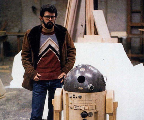 Here’s legendary director George Lucas with an early version of R2-D2. R2-D2 and fellow robot C-3PO are the only two characters to appear in all sevenStar Wars films. An actor named Kenny Baker played R2-D2 in the three original Star Wars trilogy.