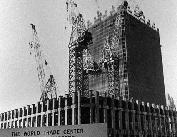 Building the World Trade Center in New York City, 1970. The original WTC was a large complex of seven buildings in Lower Manhattan, New York City. It was destroyed in the September 11, 2001 terror attacks.