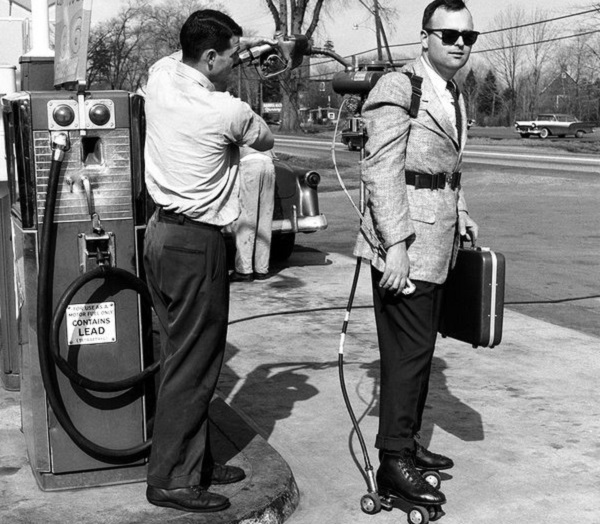 Looks like someone is gassing up for a trip on the town. This photo was taken in 1961. Motorized roller skates were briefly popular in the 1960s, with the Motorized Roller Skate company in Detroit manufacturing self-propelled skates powered by a one-horsepower engine worn on the back like a backpack.