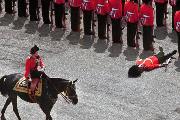 There are a couple of reasons a Royal Guard might faint. It could’ve been the temperature, or he could’ve been locking his knees. Combined with the nerves that must come from the Queen’s watchful eyes on your back, we can understand why this guard lost his balance.