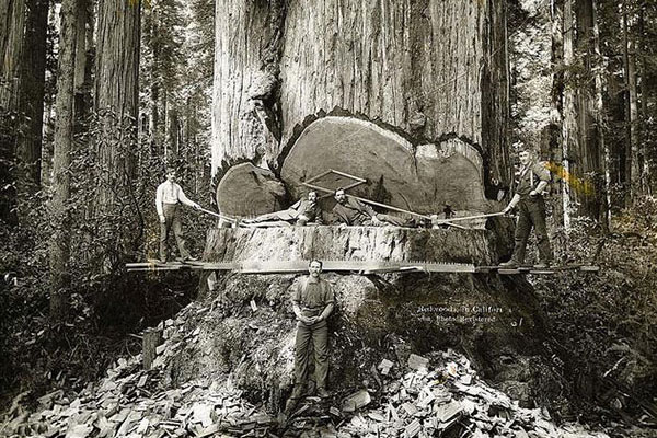 This photo from the 1950s era shows Canadian lumberjacks cutting down giant redwood trees. The size of the trees made them prime lumber. Some of these trees were over 1,000 years old when they were harvested. It is so sad to see the majestic beauties cut down.