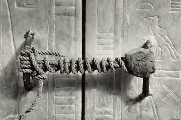 This is the unbroken seal on Tutankhamun’s (AKA King Tut’s) tomb in Egypt. The tomb was discovered in 1922 by Howard Carter and Lord Carnavon. It was nearly intact, making it a major archaeological discovery, and it received worldwide press coverage.