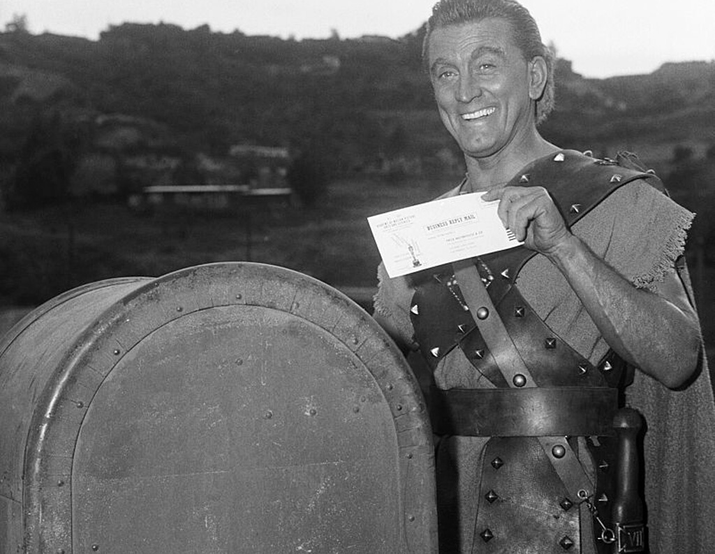 Still in his costume from his film Spartacus, Kirk Douglas mails off his ballot for the Academy Awards in 1960. Kirk Douglas was a huge film star during the 1950s and the 60s. During his acting career, he earned three Academy Award nominations, an Oscar Lifetime Achievement Award, and the Presidential Medal of Freedom.