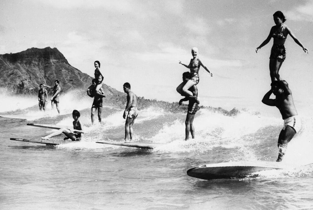 Circa 1960, a group of surfer perform surfing maneuvers in Hawaii. In the 1960s, surfing didn't have the reputation that it does today. While surfing had been around in the 1930s and 40s, it wasn't until the late 1950s and early 60s that it really began to grow in popularity.