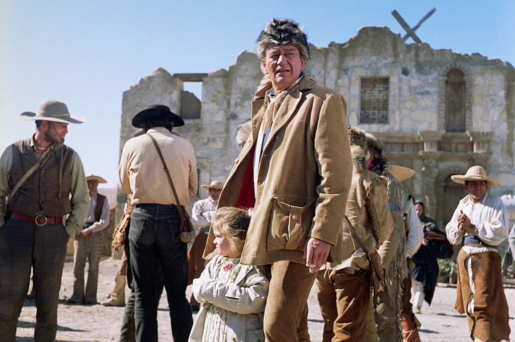 This photo from 1960 captures the legendary actor John Wayne, also known as "The Duke," standing with his daughter on the set of the Western film The Alamo.