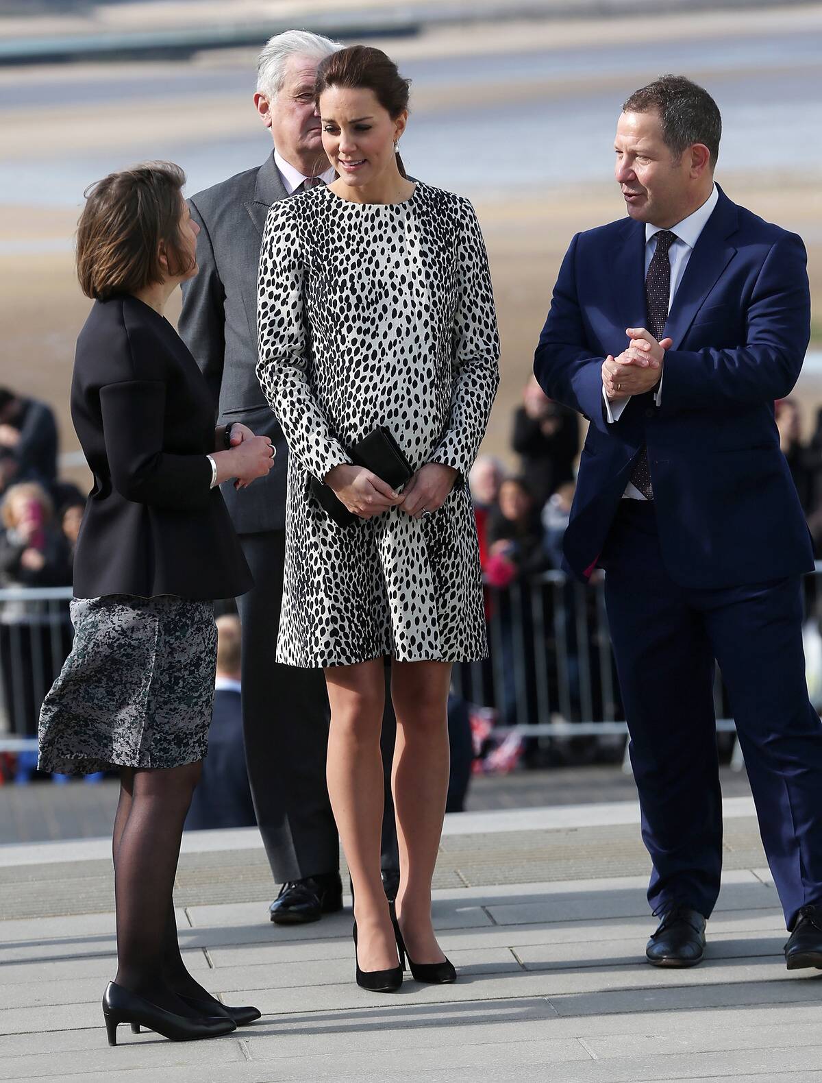 Do we see a mini bump here? It looks like little Charlotte is poking through her mom’s belly! Baby bump or not, Kate Middleton always looks stunning and polished. The Duchess is ready for whatever the day has in store for her. Here, she is attending the Place2be Wellbeing in schools award at Kensington Palace and looks incredible in her sheer polka dot blouse and knee-length navy skirt.
