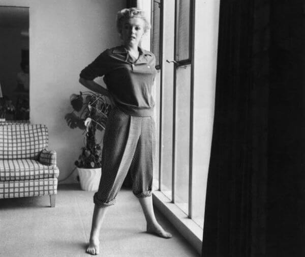 This picture, taken around 1955, shows a different side to the sex symbol. Wearing checkered pants and a loose sweatshirt, Marilyn stands barefoot by the window at home. Shots like this give us an insight into the side of Marilyn seldom seen to the public. She was a star at the height of her fame, yes, but an ordinary woman first.