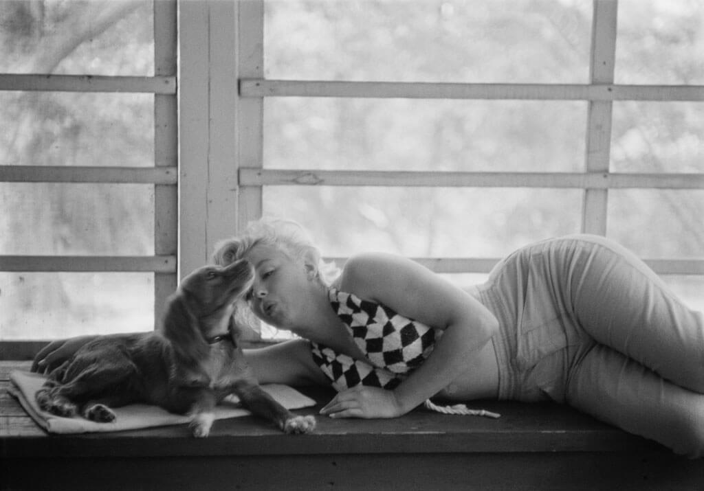 Her first husband once recalled that during their marriage, he had to stop her from trying to bring a cow into their house to get it out of the rain. Here she is, enjoying a round of cuddling with a small dog. This moment was captured in 1960, during filming of The Misfits in the Nevada Desert.