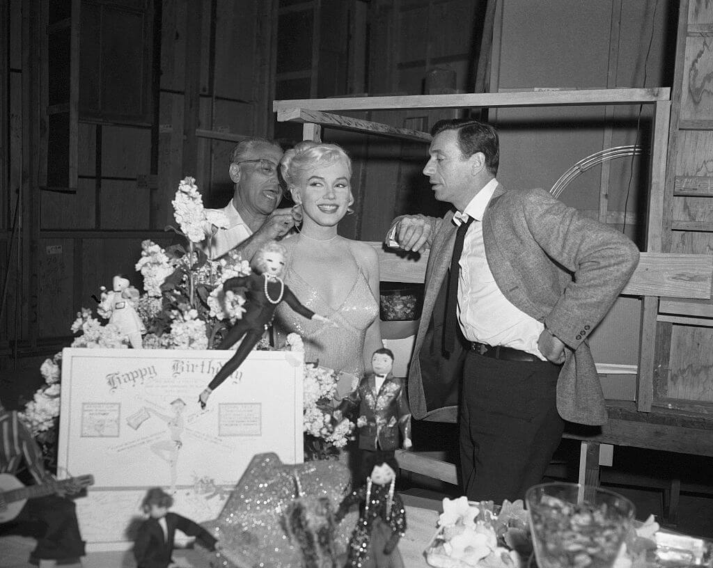In this photo, Marilyn stands smiling as director George Cukor fastens a pearl necklace, given to her by the cast for her birthday, around her neck. Yves looks on. According to Marilyn's friend and neighbor Freda Hull, the star miscarried on the set of her final film, The Misfits. The affair was a media circus, which the studio hoped would help the film's success. It didn't.