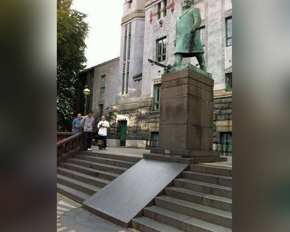 That would be one hell of a drop. I'm not sure who that's supposed to be a statue of, but it's probably somebody very important who never set foot on a skateboard.