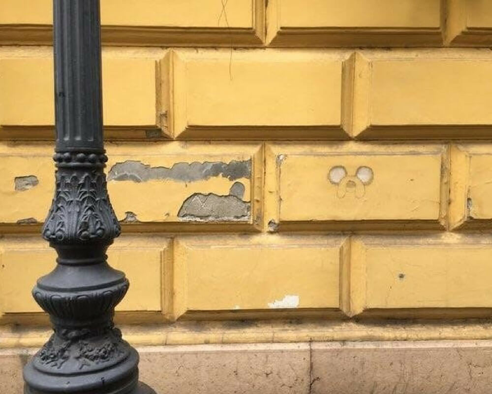 This beautiful Jake graffiti was spotted in Budapest. It's adventure time, come on, grab your friends, and draw Jake's face on every brick you can find— in pencil, of course, because we don't want to damage property.