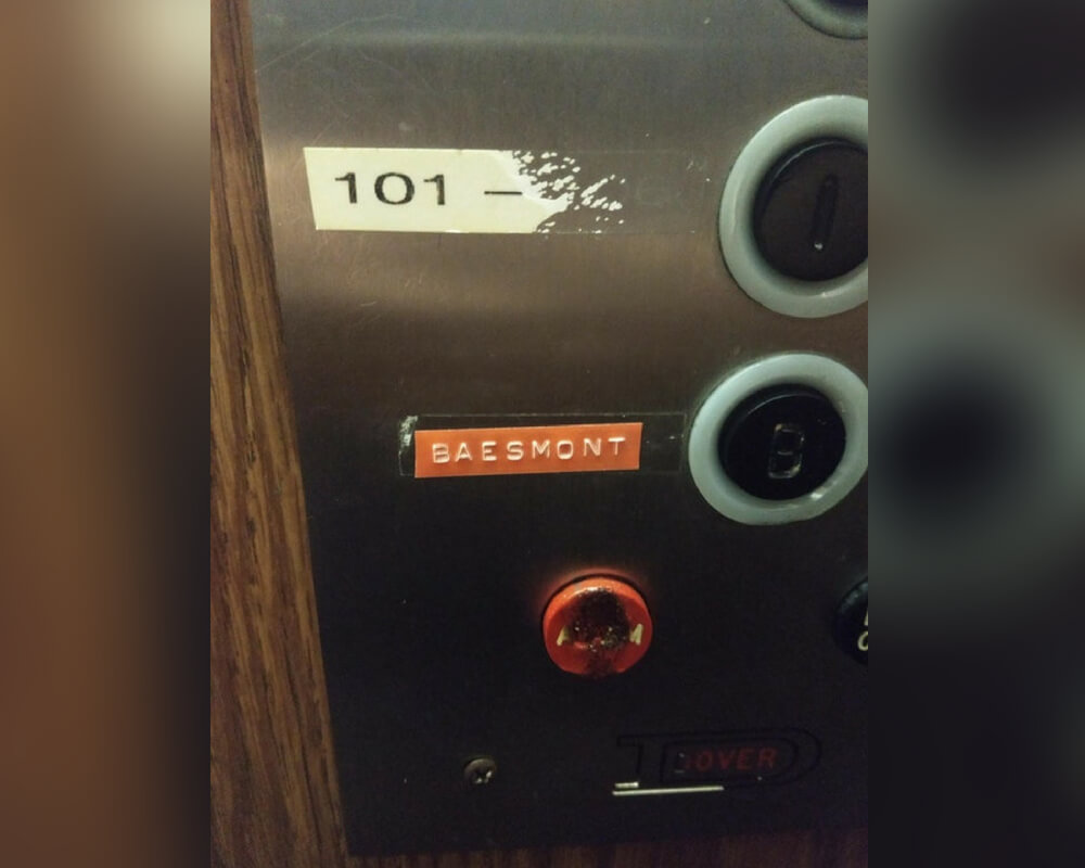 Someone replaced the missing label on this elevator so that people know how to get to the "baesmont."