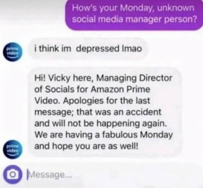 You're usually talking to a bot with the first message to customer service — so this was either a bot that's become self-aware, or it is in fact a real person.
