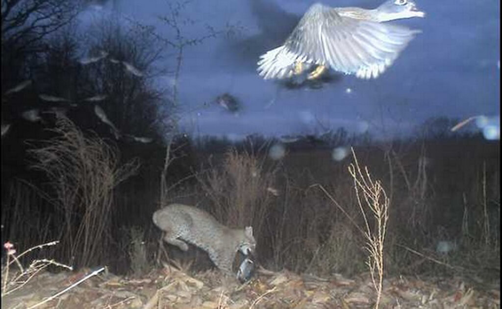 This trail cam really caught an image of some serious action in the wilderness. A wild lynx runs off with a fresh kill as a duck flies right overhead. The duck should count its blessings because it just as easily could have been him in the lynx's mouth.