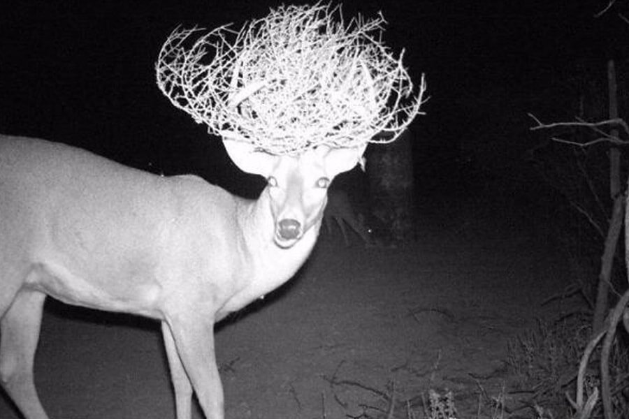 Horns are just inconvenient for a buck. This young stud will never get the tumbleweed off his head. Maybe if someone had been around when he walked past the camera, his problem would be solved.