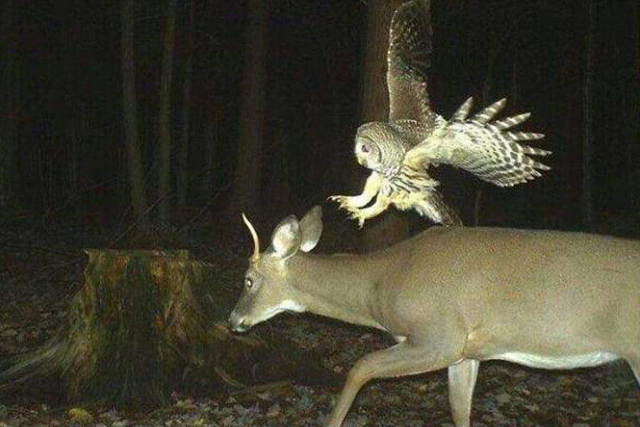 Here we have a deer trying to have a peaceful midnight stroll: take in the sights, contemplate life, and look at the stars. Then what happens? An owl swoops down out of nowhere to ruin the peaceful evening! How rude!